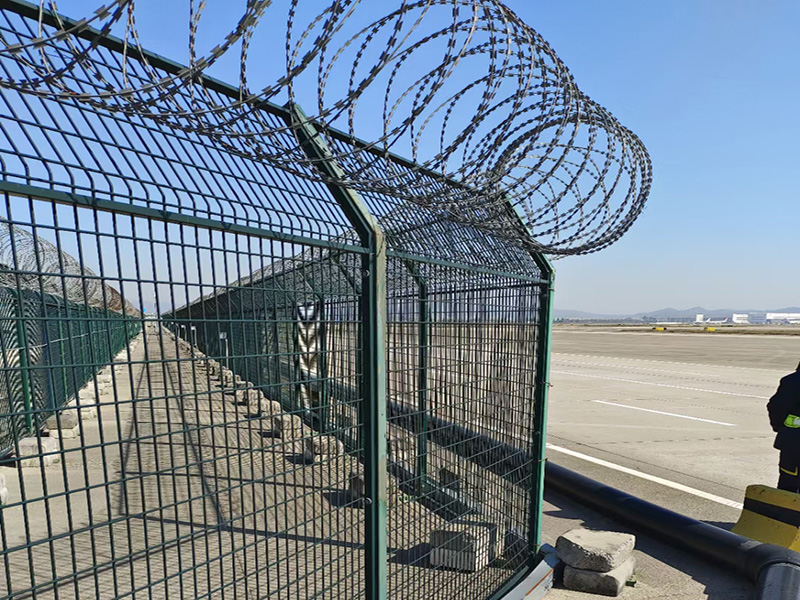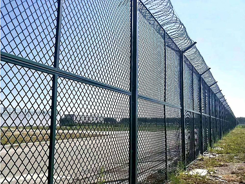 機場護欄網又稱作“Y型安全防御護網”,由Y型支架立拄,加強型焊接網,安全防盜連接件和熱鍍鋅刀片刺網組成,是強度和安全防御性級別很高的圍界護欄網產品。被廣泛應用在機場、軍事基地等高安全場所。機場護欄網的突出特點就是美觀實用、安全性高、防攀爬能力好,網體連接方式采用特制SBS緊扣件,有效防止人為的破壞性拆卸,橫向四道折彎加強筋,使網面強度顯著增加。